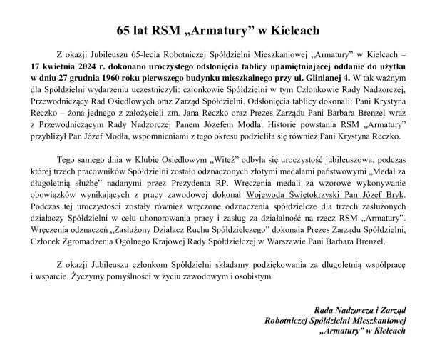W dniu 17.04.2024 r. odbyły się uroczyste obchody 65-lecia RSM "Armatury".